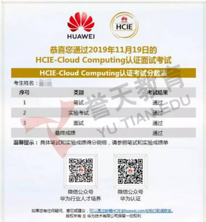 随着考试的来临,我们小群里的小伙伴也都一个个的顺利通过了云计算的面试考试,拿到了属于自己的HCIE证书。当然,我也在11月19日顺利通过了HCIE面试考试。 经过长达8个月的学习,我认识了挺多小伙伴,收获了知识也收获了友情,也对今后的职业有了更加确定的规划。感谢邹SIR以及各位誉天老师们的教导,感谢各位同学的帮助,学习虽然很苦,可是结果一定很甜。祝接下来要考证的小伙伴们考证顺利,加油!